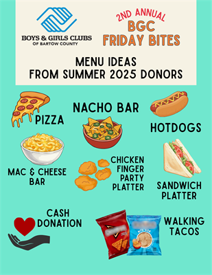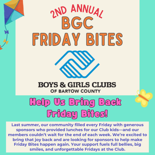 Last summer, our community filled every Friday with generous sponsors who provided lunches for our Club kids—and our members couldn’t wait for the end of each week. We’re excited to bring that joy back and are looking for sponsors to help make Friday Bites happen again. Your support fuels full bellies, big smiles, and unforgettable Fridays at the Club.